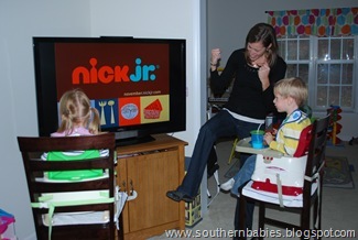 Callie convinced me to let the kids eat their dinner in front of the tv Friday evening so they could watch their favorite tv show. She is celebrating her victory in this picture.